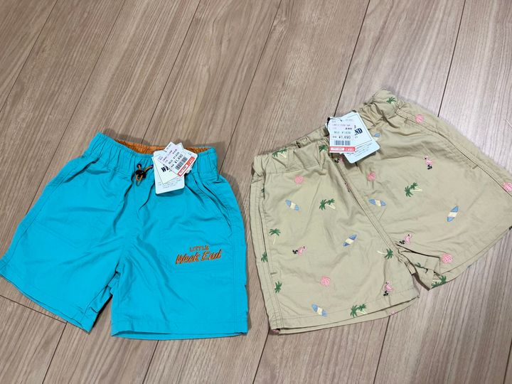 速乾素材で水遊びに適したハーフパンツ、丈が短くて涼しそうです!ベージュ色の方は総柄刺繍、南国柄がかわいいです♪