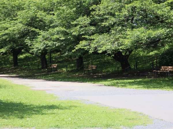 春には満開だった桜の木の葉が豊かに生い茂り、涼しい日陰を作ってくれています。 ベンチも設置されているので、のんびり休憩するにはもってこいのスペースです。