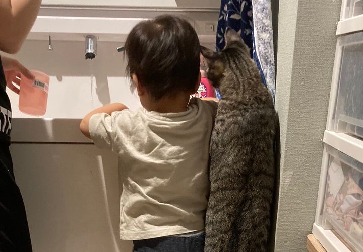 洗面台で興味津々の1歳児の“そっくり後ろ姿”に「可愛すぎる」「長い!?」と話題