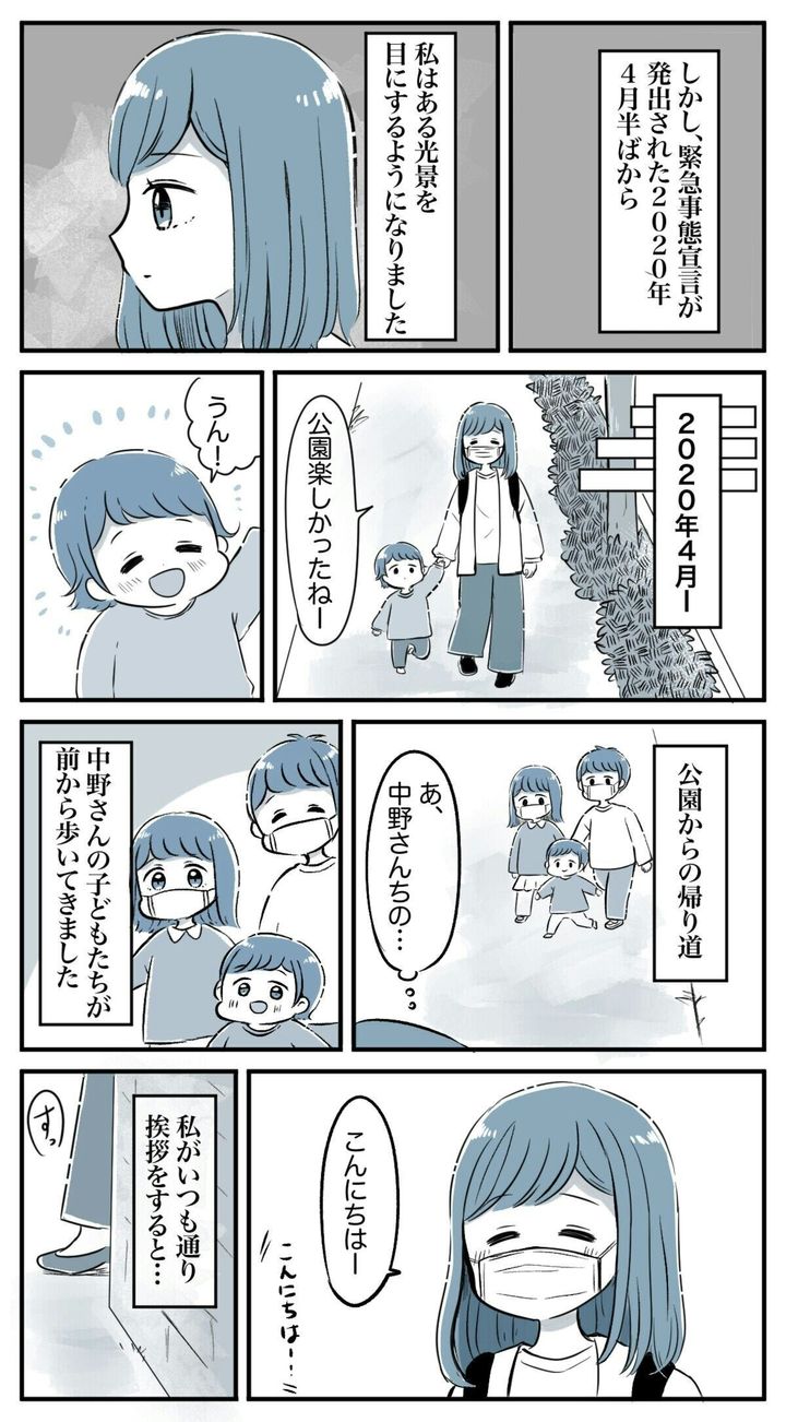 悩んだ結果、児童相談所に通告をした主人公。その後、公園で見かけた中野さん夫婦は以前のようなあたたかい雰囲気に戻っていたと言います。このコロナ禍、もしかしたら親たちも知らないうちに追い詰められていた可能性も。