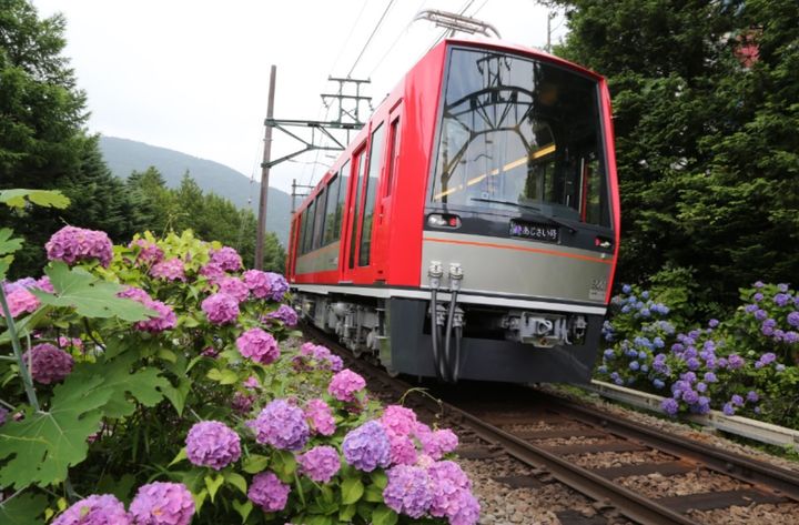 箱根登山電車沿線では例年6月中旬頃からアジサイが見頃を迎えます。この時期の箱根登山電車は車窓に触れるほどに咲き誇るアジサイの中を進むため、「箱根あじさい電車」の愛称で親しまれています。
