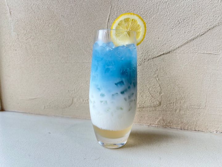 「あじさいラテ」770円は、バタフライピーティー、ミルク、レモネードが3層になったドリンク。よ~く混ぜると、さわやかな味わいとまろやかなミルクが絶妙にマッチし、フルーティーなオリジナルラテに。トッピングのレモンを入れるとさらにさっぱりとした味わいに変化します。