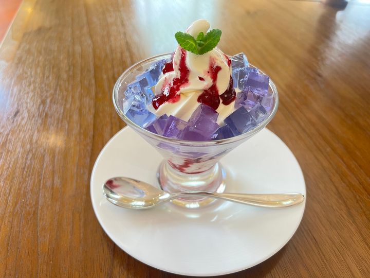 「あじさいサンデー」770円は毎年好評のメニューで、ブルーベリーソースとバタフライピーティーのゼリーがさっぱりとした味わい。