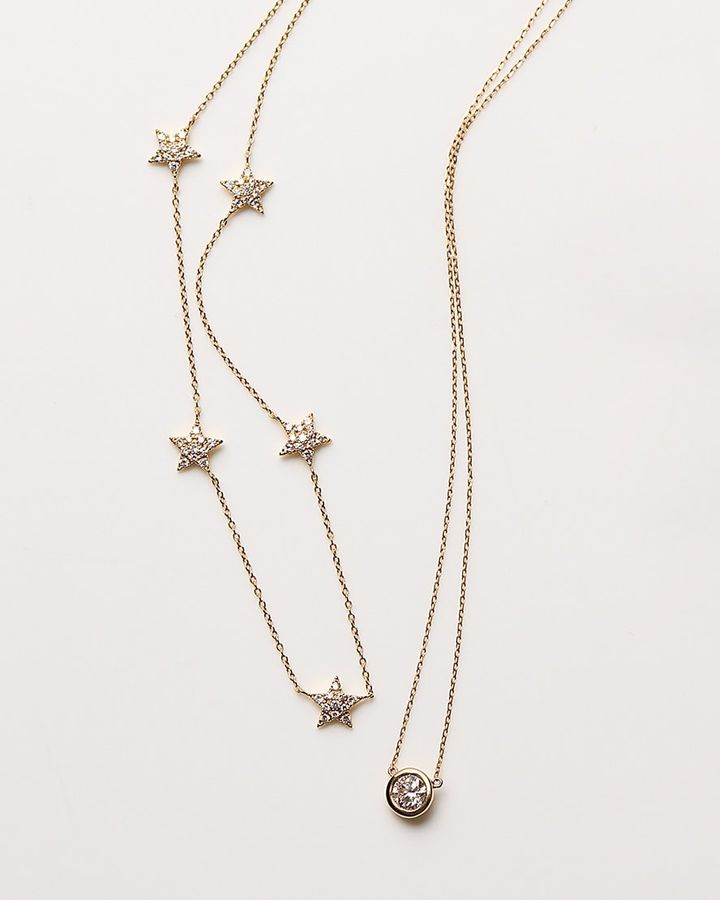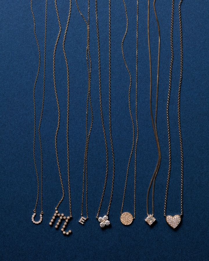 右から:♡リバーシブルネックレス[K14YG×DIA×ブラックDIA]¥198,000(ベッティーナ ジャヴァエリ/ロンハーマン)、◇ネックレス[K18YG×DIA]¥187,000(ベルシオラ)、○ネックレス[K18YG×DIA]¥121,000(アガット)、フラワーネックレス[K18YG×DIA]¥297,000(ヴァンドーム青山/ヴァンドーム青山本店)、Eネックレス[K18YG×DIA]¥41,800(ete)、星座ネックレス[K18YG×DIA]¥159,840(GIGI/ホワイトオフィス)、馬蹄ネックレス[K18YG×DIA]¥51,480(シエナロゼ/シエナロゼ表参道ヒルズ店)