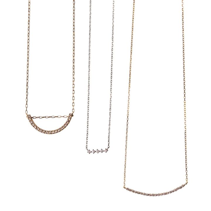右から:ネックレス[K18YG×DIA]¥66,000(4℃/エフ・ディ・シィ・プロダクツ)、5粒ネックレス[PT900×PT850×DIA]¥57,200(ete)、Uネックレス[K10YG×DIA]¥129,800 (ヒロタカ/ヒロタカ 表参道ヒルズ)