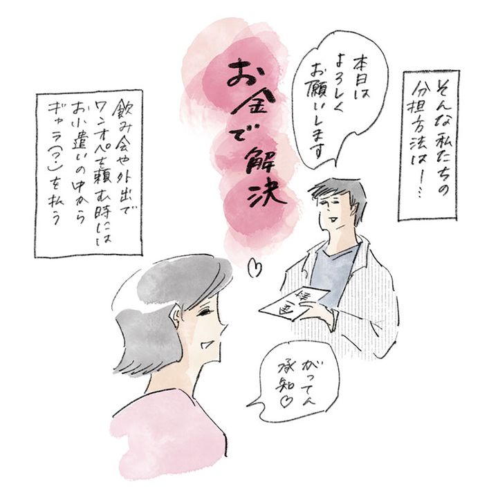 夫は仕事柄、会食が多め。産後仕事量をセーブした私からすると、家計を支えてくれることに感謝しつつも、思いっきり仕事をしている夫がうらやましくて。また、慣れないワンオペでストレスも多く、イライラをため込んでいました。家事育児の負担に関する幾度ものケンカを経て、私が半分冗談で「じゃあ、ワンオペの時はお金を払ってよ」と言ってみたら、意外にもOK。我が家はそれぞれが年間に使っていい同額の予算を決めています。ワンオペ手当制度では、お願いする方が自分の予算から相手に取り決めた金額を支払うことに。帰宅が24時を回ると深夜手当としてプラス料金、出張の時は1泊いくら…とルール決め。制度を取り入れてから、お互い自分の予定で出かける際の罪悪感が減ると同時に、入った手当で何を買おうかとワンオペがむしろ楽しみに。また、夫が子どもを見てくれている時間も思った以上に多く、私から夫に多めの手当を支払うことになった月も。これまでのモヤモヤがお金を介在させるだけでこんなにすっきり解消できてびっくり!