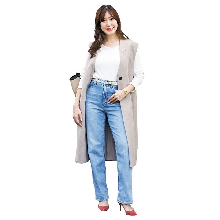 脚のラインを拾いすぎないストレートはブラウスやとろみトップスなどオフィスアイテムと好相性。 デニムパンツ[ローライズストレート]¥30,800(ヤヌーク/カイタックインターナショナル)トップス¥26,400(ウィム ガゼット/ウィム ガゼット 玉川髙島屋S・C店)ジャケット¥52,800(バッカ/ビー エディション ニュウマン新宿店)ピアス¥85,800〈モニス〉ブレスレット¥6,600〈エイチアッシュ〉(ともにフォーティーン ショールーム)バッグ¥24,200(2.718/ガリャルダガランテ 青山店)靴¥69,300(ペリーコ/ユナイテッドアローズ 六本木ヒルズ店)