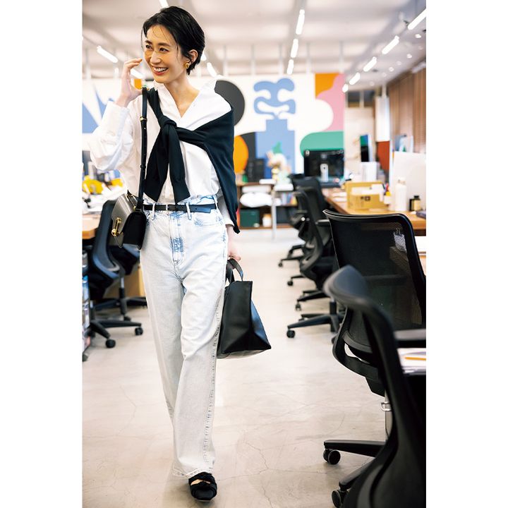 クリーンな印象で穿ける淡色だから、白パンをデニムに置き換えたらいつものモノトーンもぐっと新鮮に。オフィスでも安心の配色だから、難しくない!