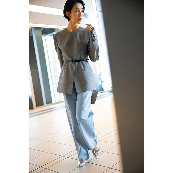 淡色デニムとトーンを合わせた、ベージュやグレーならオフィスでの上品さも担保。デニムならではの色落ちや風合いも活かしたコーデを楽しんで。