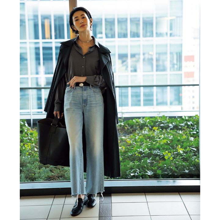 裾の切りっぱなしとローファーが好バランス。 カットオフデニムパンツ¥42,900(マザー/リトルリーグ)トレンチコート¥36,300(アダム エロぺ)シャツ¥35,200(ウィム ガゼット/ウィム ガゼット 玉川髙島屋S・C店)ピアス¥8,400(アビステ)ネックレス¥12,100(イットアトリエ/フォーティーン ショールーム)ベルト¥24,200(ア ヴァケーション/ノーベルバ)トートバッグ¥21,450(アンドミューク/ユナイテッドアローズ 六本木ヒルズ店)ローファー¥28,600(ギャルリー・ヴィー/ギャルリー・ヴィー 丸の内店)