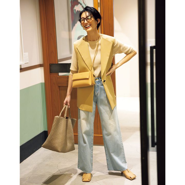 角度によりベージュみを感じられ、生地のハリ感と美ラインを演出するワイドストレート。 ワイドデニムパンツ¥41,800〈TU ES MON TRESOR〉トートバッグ¥53,900〈NAGHEDI〉(ともにマルティニーク ルミネ横浜)ジレ¥39,600(デ・プレ)プルオーバー¥18,150(ガリャルダガランテ/ガリャルダガランテ 青山店)メガネ¥49,500(アヤメ)ピアス¥104,500ブレスレット¥58,300(ともにウノアエレ/ウノアエレ ジャパン)ショルダーバッグ¥26,950(ヤーキ/ヤーキ オンラインストア)靴¥64,900(ペリーコ/アマン)