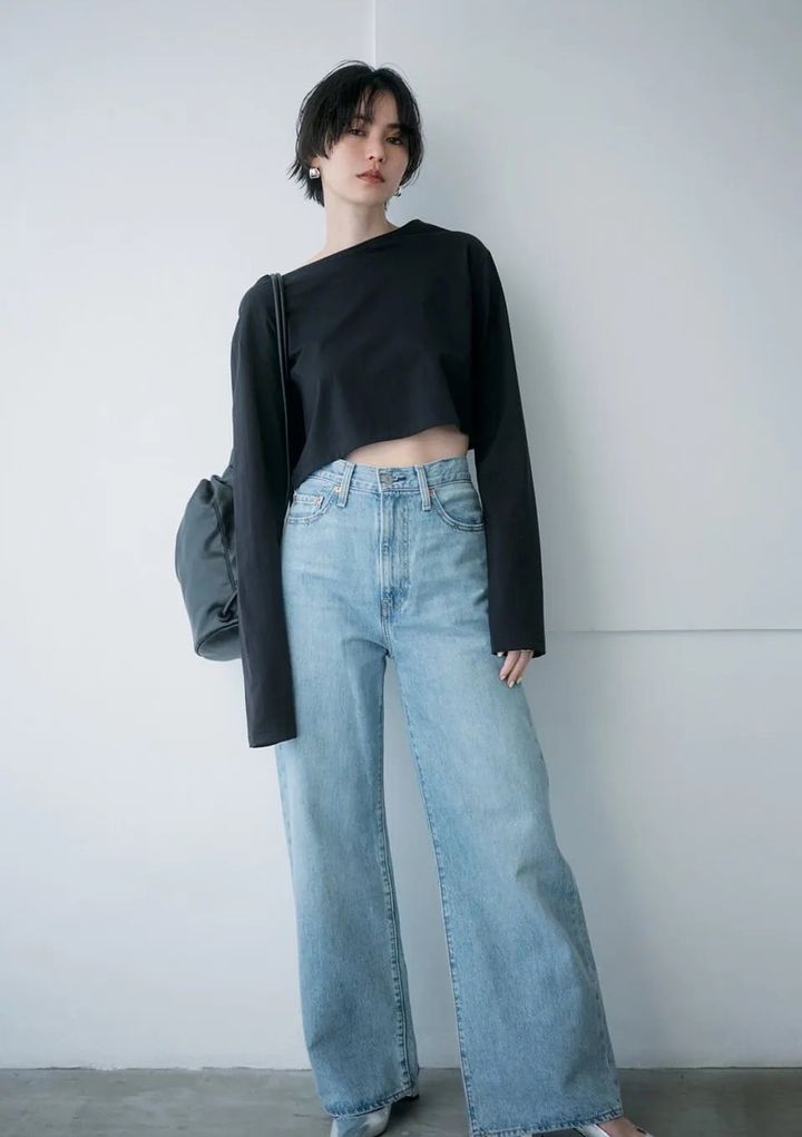 【第1位】 クロップトトップスとワイドデニム 肌見せ具合&バランスがまさに旬!