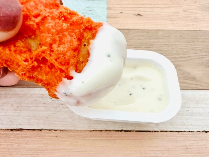 まずは何もつけないでひとくち。見た目からは“激辛”をイメージしますが、ここは“旨辛”というワードがぴったりです。ナゲットをつまんだ指先に赤いパウダーが付いたり、辛味が残ることはありませんでした。