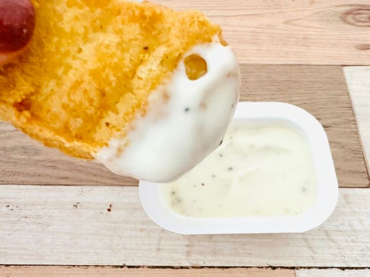 まずはソースそのもののおいしさを確かめるために、「チキンマックナゲット」を「サワークリームオニオンソース」にディップして味わってみます。