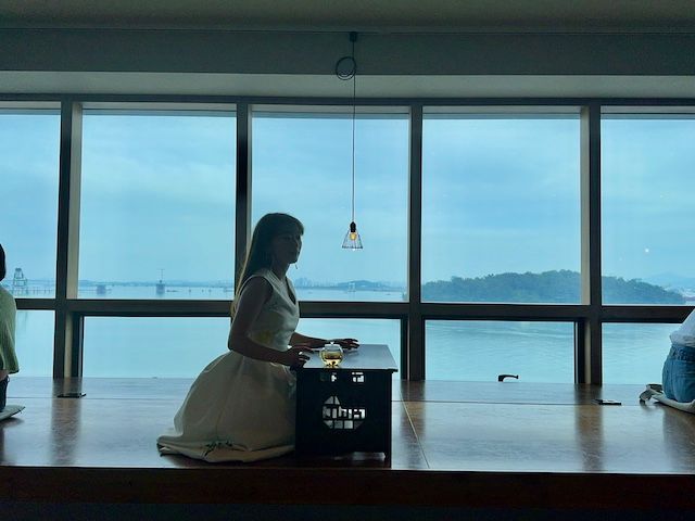 「차덕분」は仁川周辺で筆者が1番推したいカフェ! 韓国の伝統茶をアフタヌーンティーのように楽しめるのです。雑居ビルの8階に上がると、お茶を楽しめる空間が! 海が見える窓辺に、畳の上に上がって伝統茶を楽しめる環境は、他ではなかなか見られません。