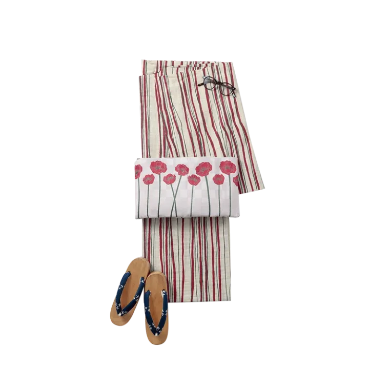 ベージュよろけ縞浴衣 参考商品/utatane アネモネ半巾帯 28,600円/ふりふ(ふりふ新宿店) めがね 47,300円/MOSCOT(MOSCOT Tokyo) 下駄 参考商品/和風館ICHI