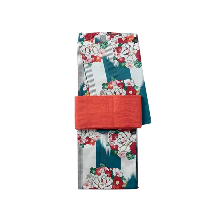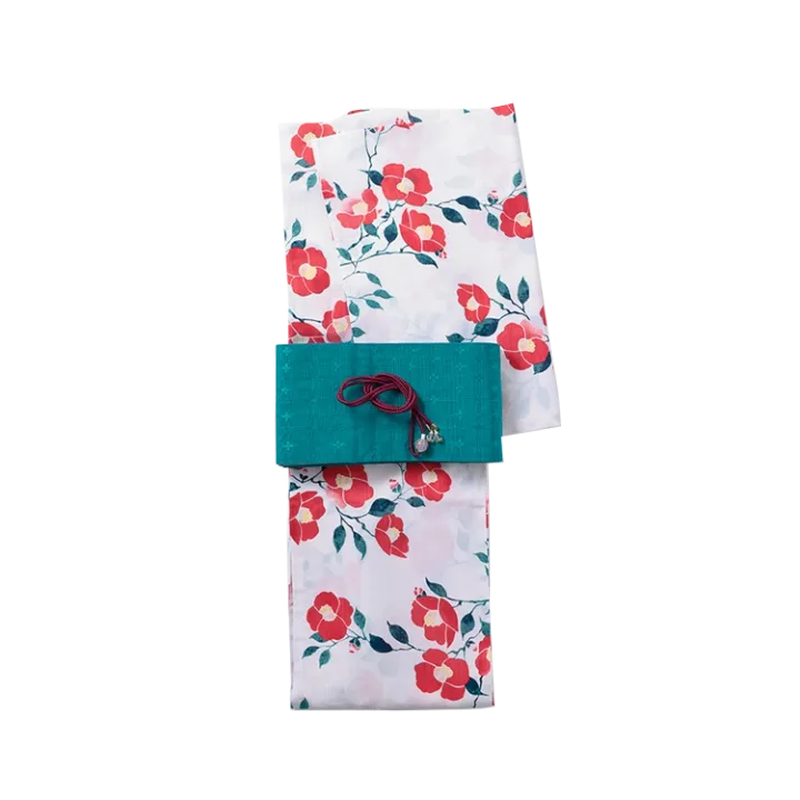 白×赤椿柄浴衣 19,800円、帯締め 6,930円、グリーン半巾帯 9,350円/以上三松