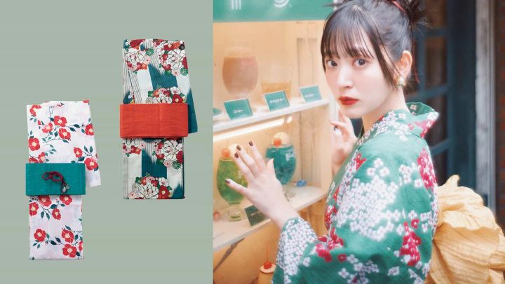 赤椿柄のレトロさに、ビジュを意識した鮮やかなグリーンの帯。おしゃれ度アップ間違いなしのコーデ。