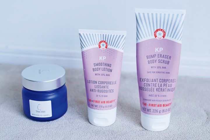 特にケアしたいのがお尻。マッサージを受けたとき「お尻のざらつきが気になる」と言ったらオススメされたFirst aid beauty のスクラブとボディローションを週1で愛用。全身はTAKAMIのスキンピールボディで。