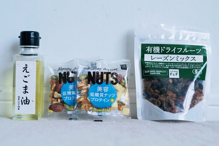 小腹が空いたときには有機栽培のレーズンや低糖質のナッツを。エゴマ油はコーヒーやヨーグルトなどにも入れています。糖質には気を遣って、普段から白砂糖は使わず、てんさい糖やメープルシロップを愛用。