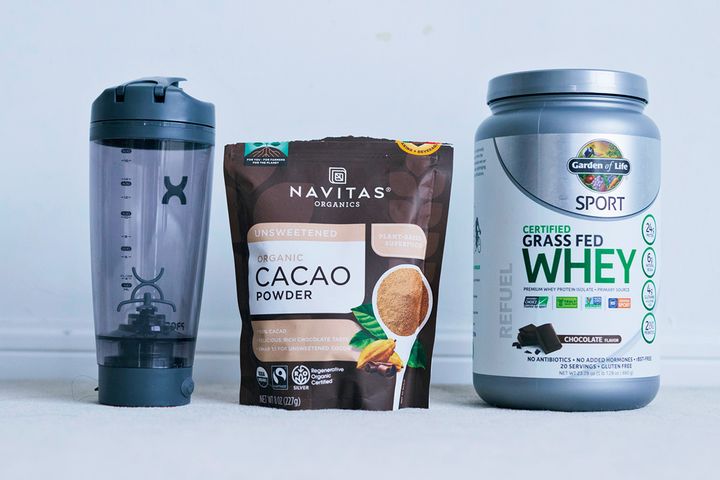 朝食代わりにすることもあるプロテイン。チョコレート風味のプロテインとカカオパウダーを、その日の気分でミックス。オーツミルクや水と一緒に電動式のシェイカーでシェイクしています。
