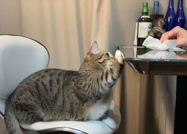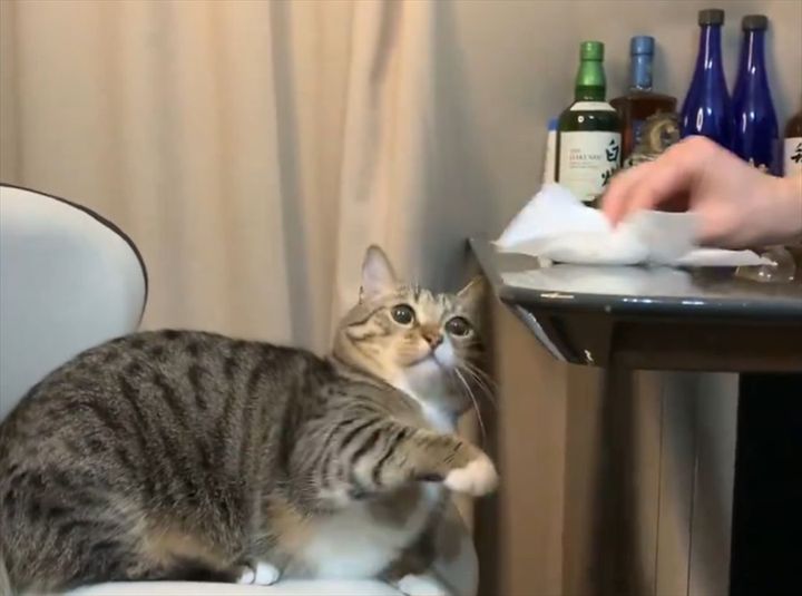 テーブル拭きをする飼い主さんの手の動きを追うネコ。 おててを伸ばして捕まえようとしていますが、これがとても楽しかったみたい!
