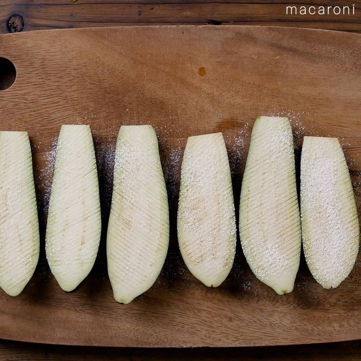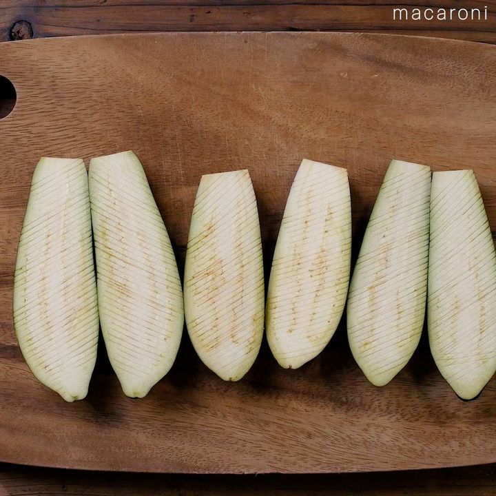 1: なすは縦半分に切って、断面にねぎカッターで切り込みを入れます。