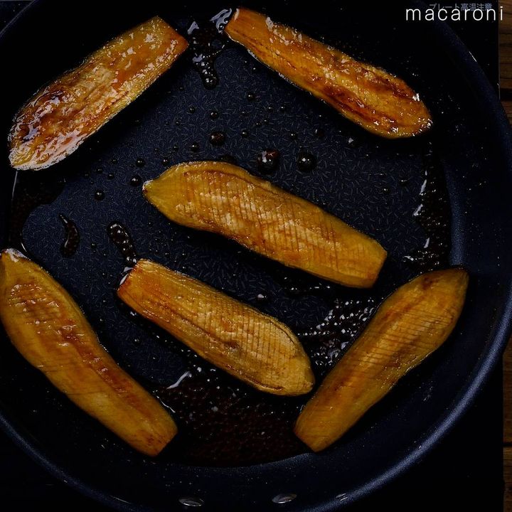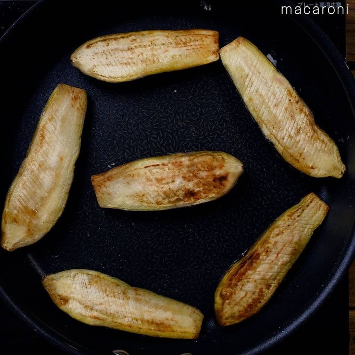 4: フライパンにサラダ油を引き中火で熱し、なすを入れて両面焼き目がつくまで焼きます。