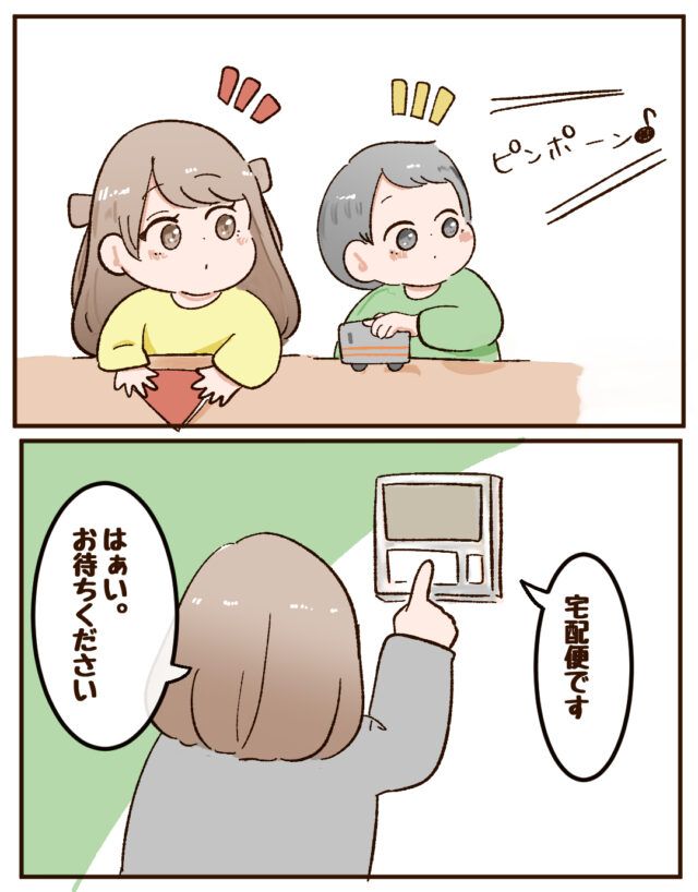 長女みーちゃん、長男はーくん、1歳7ヶ月差の年子姉弟のママである和栗ぐりさんから、インターホンが鳴った時の子ども達のリアクションのお話が届きました。みーちゃんとはーくんはどんなリアクションをしたのでしょうか?