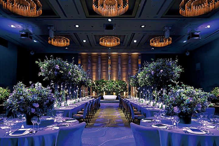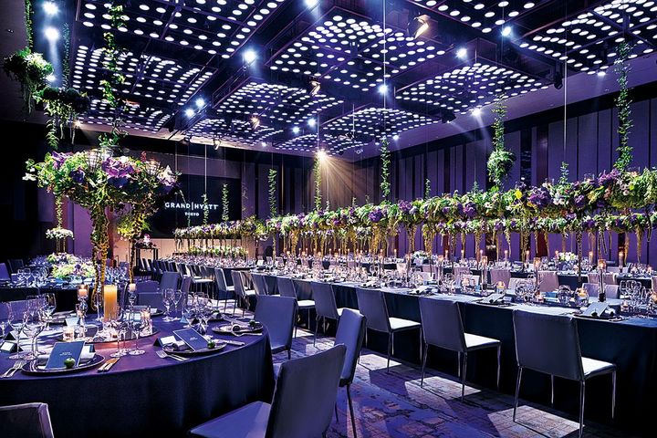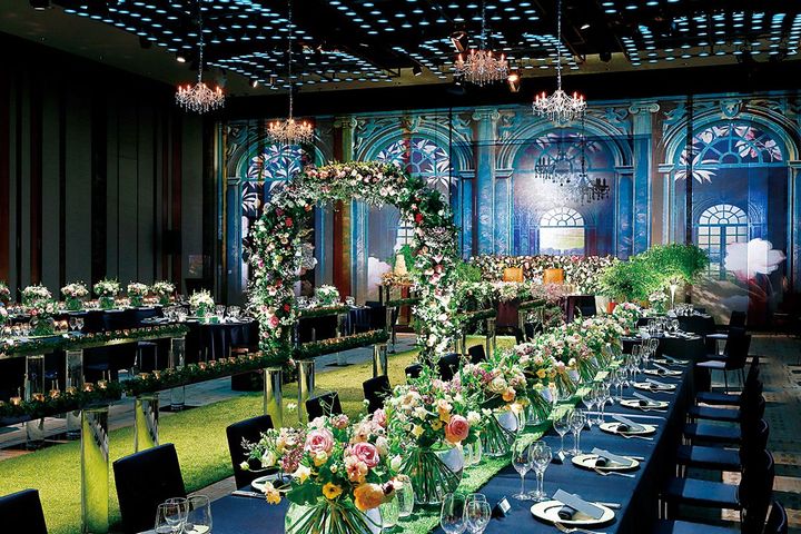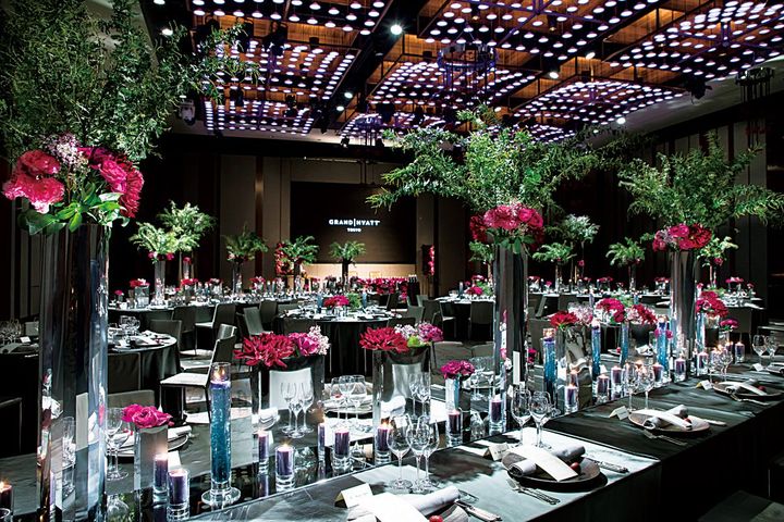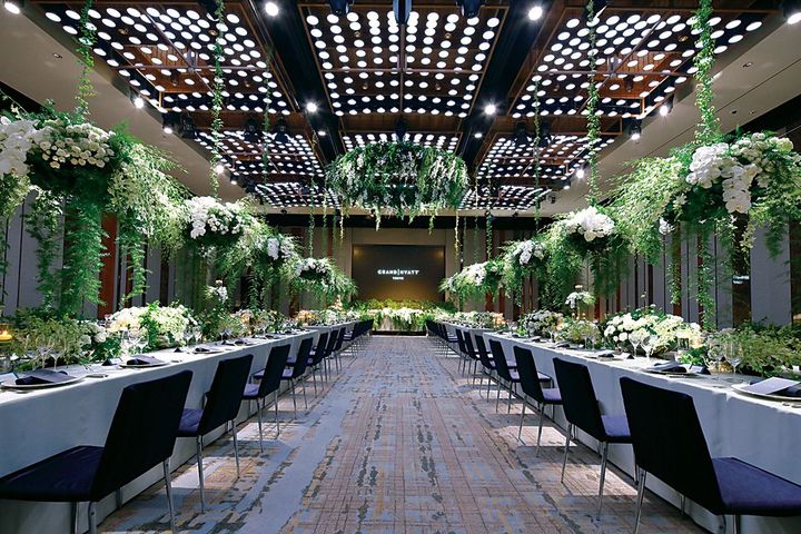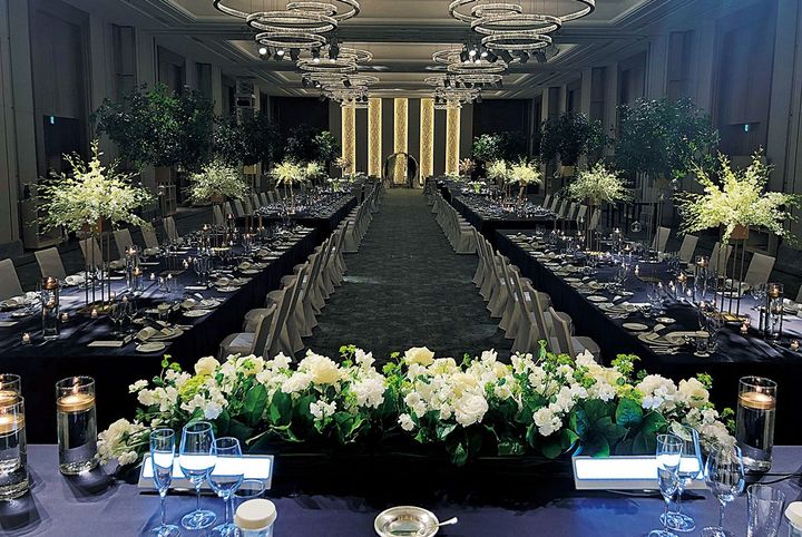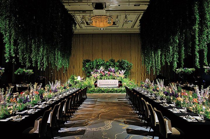 「グランド ハイアット 東京」の「グランド ボールルーム」はロングテーブルのしつらえが映えるスペース。このように大きな会場は、天井の高さを利用したダイナミックなコーディネートが好相性。写真は、なんと天井にもフラワーアレンジをしたハンギングスタイル。