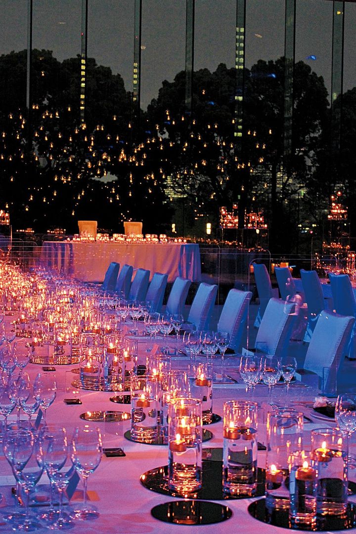 ドラマチックな雰囲気を演出するのに、柔らかい光を放つキャンドルを利用しない手はありません。写真は「パレスホテル東京」の「葵西」で、無数のキャンドルをテーブルや高砂のバックに飾り、大きな窓にその明かりが映し出されるようデザインしたもの。