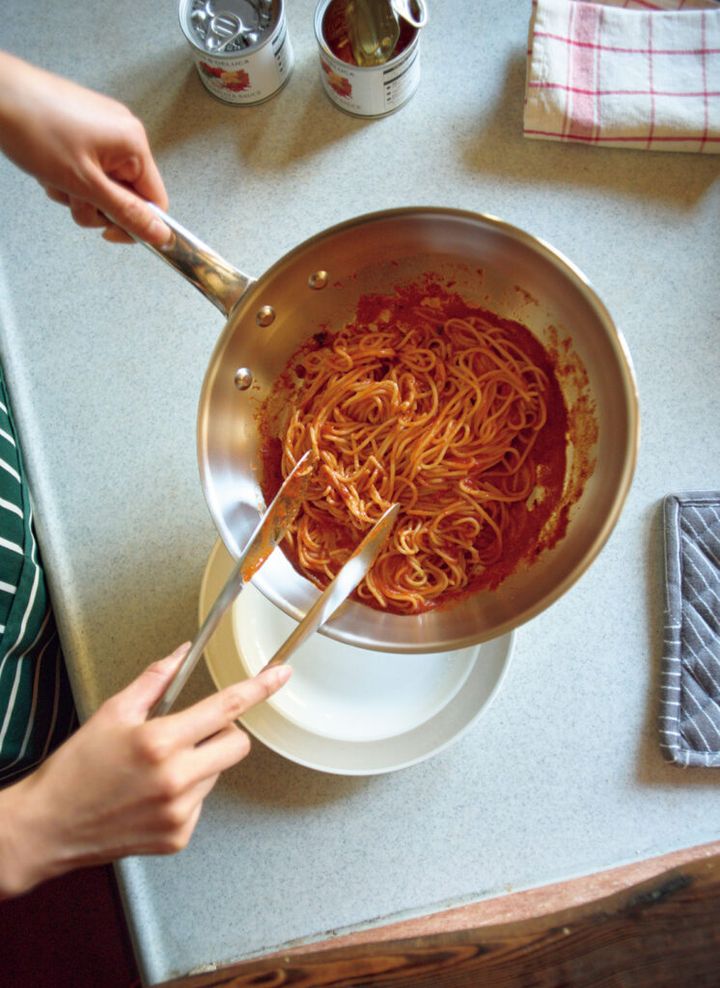 熱しやすく冷めやすいアルミのフライパンは火力の変化がすぐに食材に伝わって、簡単な料理もぐっと楽しくなる。ハンドルが熱くなりやすいけれど、軽くて取り回しやすいし、火から下ろして熱いうちにさっと手入れすればきれいに保てるのもいい。ひとつ持っておくなら、間違いのない〈中尾アルミ製作所〉のものを。半世紀以上もレストランやホテルで業務用として支持されるのは、純度の高い国産アルミ材を3㎜と厚めに仕立て、熱ムラが生まれにくいつくりだから。大切に使って、一生ものにしたい。∅24㎝¥7,150(中尾アルミ製作所 03−5830−2511) エプロン¥7,480(ラッシュブルックス/マークスインターナショナル 03−6861−4511) パスタソース缶1缶200g(2人前)各¥1,296(ディーン&デルーカ/ディーン&デルーカ六本木 03−5413−3580) その他スタイリスト私物
