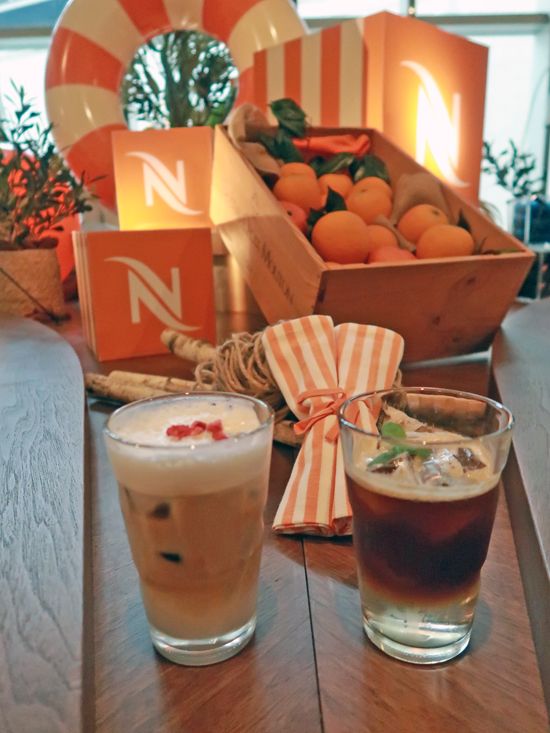 また、期間中はNESPRESSOオリジナルドリンクもお目見え。濃厚なホワイトチョコレートに甘酸っぱいラズベリーがアクセントになった「アイス ホワイトカフェモカ」(写真下左)、オレンジや柑橘系のシトラスが香る〝シュワッ〟とした「アイスインテンソ ガーデン スパークラー」(写真下右)は、グラスを横から見たときのグラデーションもきれいで個人的にお気に入り。こちらのドリンクは、アフタヌーンティーを注文すると1杯600円(通常は1,750円)になるのでかなりお得。追加で注文して、より一層楽しんじゃいましょう!