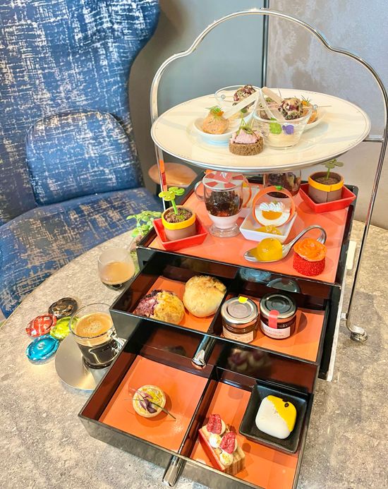 BOX一体型のティースタンドで登場。スイーツやセイボリーが引き出しの中に入っていて、開けるたびにワクワします。