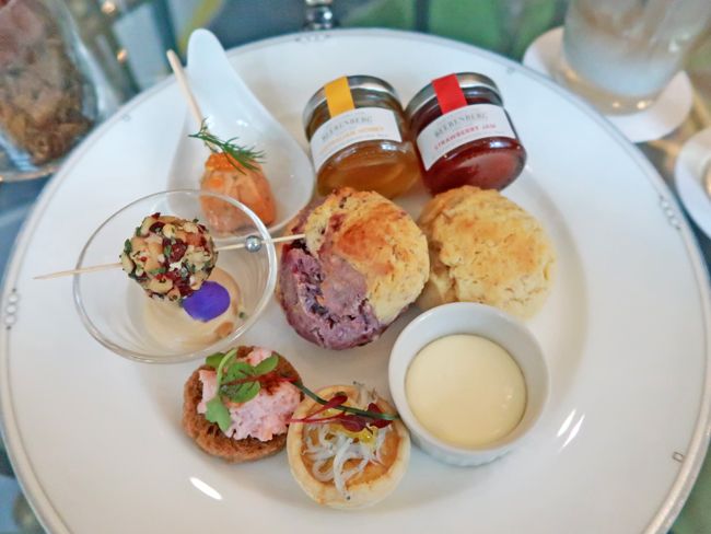 セイボリーは写真下手前から時計回りに「シラスのキッシュ」「コーヒーブリオッシュとロースハムのリエット」「クランベリーとカシューナッツのチーズボンボン コーヒークリーム」「サーモンのクレープロール フレンチキャビア」の4種類、スコーンはプレーンとカシスマーブルスコーンがスタンバイ。