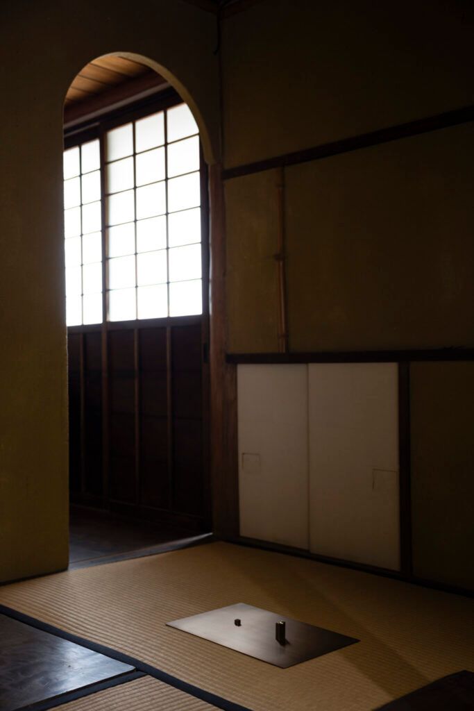旧山崎家別邸 茶室「如庵・写し」にて、新作彫刻「“Temaeza” in the Tea ceremony room」。 Photo:Takafumi Matsumura