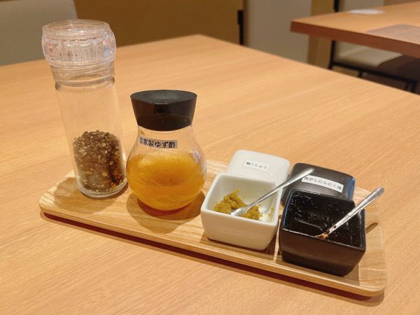 テーブルには「自家製ゆず酢」「柚子胡椒」「焦がしにんにく油」「こしょう」の4種類の調味料が置いてあって、好みで味変することが可能です!
