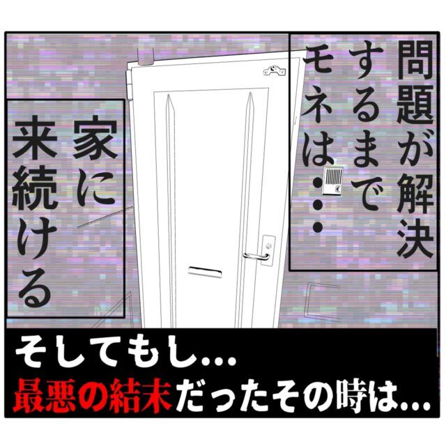 モネさんの突然の来訪に居留守を使おうとしたマリコさんに届いたのは、「部屋の電気ついてるから居るよね?」というモネさんからのメッセージ。さらに「足音も聞こえた」「玄関の前で待ってるね」というメッセージを見て恐怖を感じたマリコさん。開けないとモネさんが玄関の前でずっと待ち続けると感じ、開けたくないと思いながら恐る恐るドアを開けたのでした・・・。