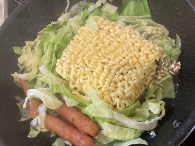 フライパンにお水を沸かして、沸騰したら麺を入れます!