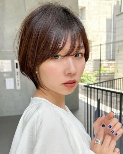 丸みシルエットが大人っぽさを引き立てるシンプルなマッシュショートも、ストレートベースで髪流れをきれいに見せつつ、長めに前髪を残して透け感を出しておでこを覗かせれば、顔印象がグッと明るくなります。また、ダークトーンのヘアカラーを合わせることで肌の白さが引き立たせるのもポイントです。
