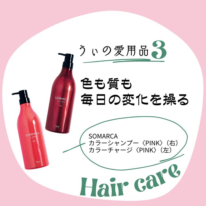 ピンク髪は洗う度に色が落ちるから、毎日の変化がつきもの! このピンクのシャントリは爪も染まらないし、品の良いピンクをキープできるからお気に入り! 無色のシャンプーと交互に使って、気分によって色味を調整しながら楽しんでいるよ! 無色のシャントリはサロンでもよく使われてるFLOWDIAのディープモイストを愛用してる。