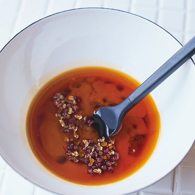 POINT/花椒は粒をすり潰してからタレに加えると◎。全体の辛さと香りが均一にならず、味の変化を楽しめる。