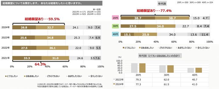 結婚願望に関する設問では、「結婚願望がある」と答えた人は全体の約59.5%。2021年の結果と比較すると、結婚願望がある人の割合は減少傾向にあることがわかります。一方20代に注目して見てみると、「結婚願望がある」と回答した人の割合は約8割と高い傾向にあるものの、前年と比較すると減少している傾向が見られました。