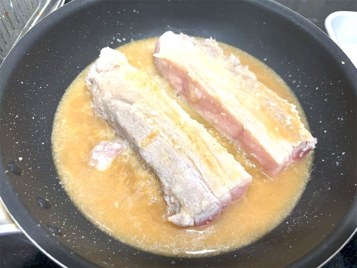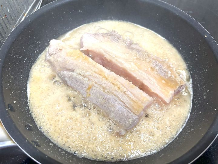 わたしはフライパンで作ったので、途中で豚肉をひっくり返したりしました。