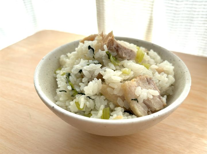 シャキシャキ青菜と手作り塩豚がいい塩梅の「小松菜と塩豚の炊き込みご飯」