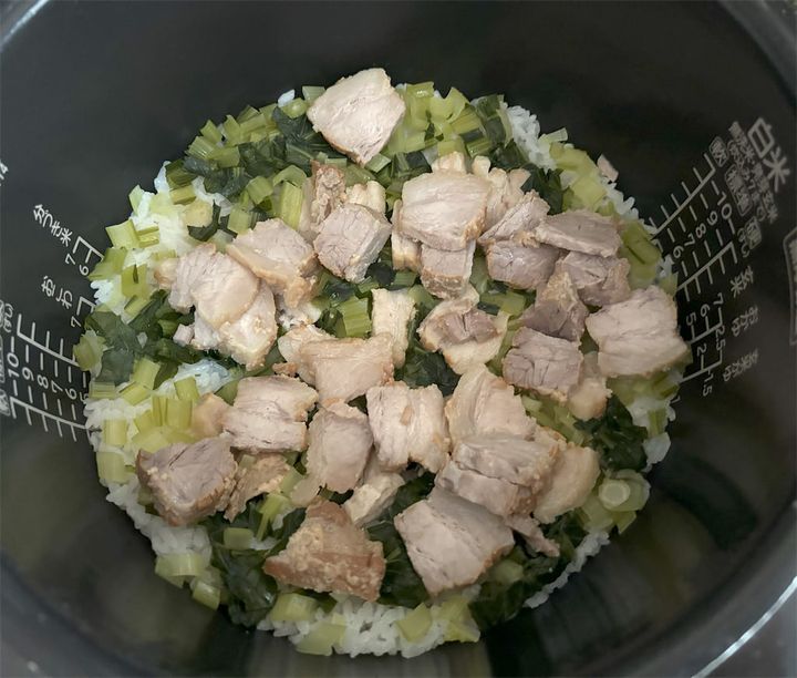 炊飯が終了したら残りの塩豚を入れ、3分ほど蒸らします。