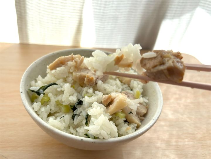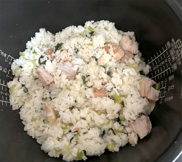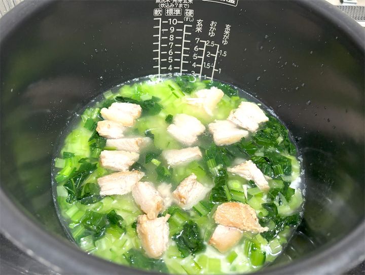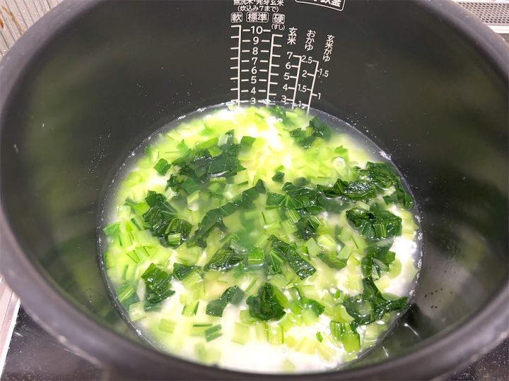 小松菜の茎の部分が炊飯後もシャキシャキしていて、食感も楽しめます。
