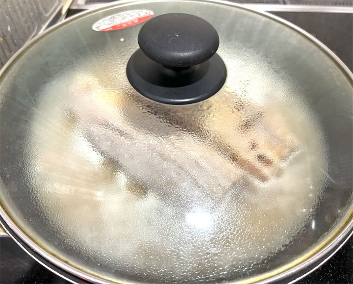 フタをして20分を目安に火にかけて炊飯し、火を止めて5分蒸らします。