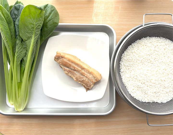 3. 【シェフ脇屋の簡単中華】この具材は中華っぽい♪「小松菜と塩豚の炊き込みご飯」に挑戦!塩豚も手作り♡