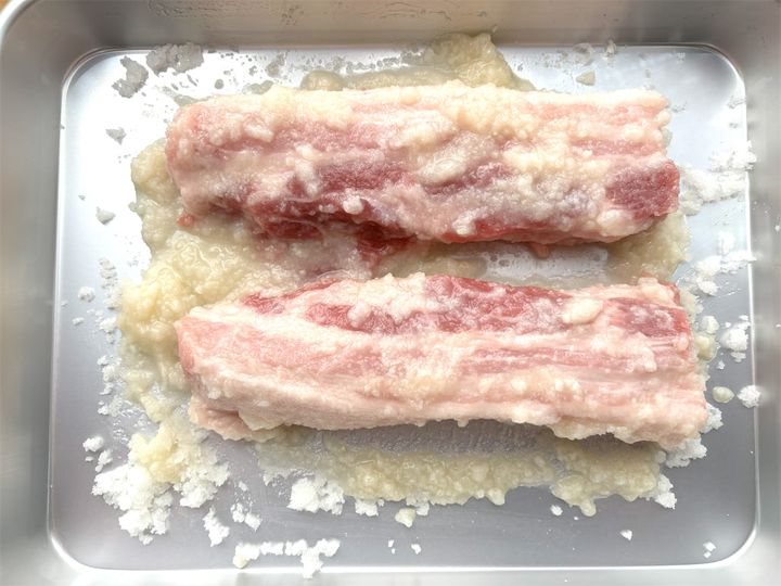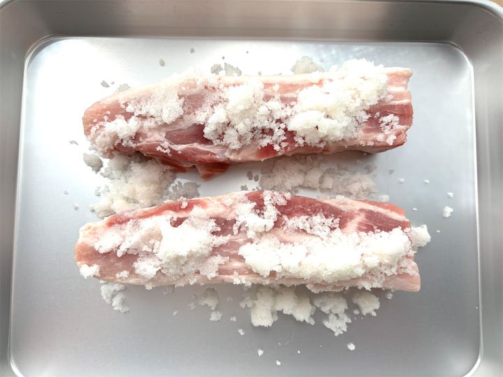 豚バラブロック肉をバットに入れて塩をふってなじませ、揉み込みます。
